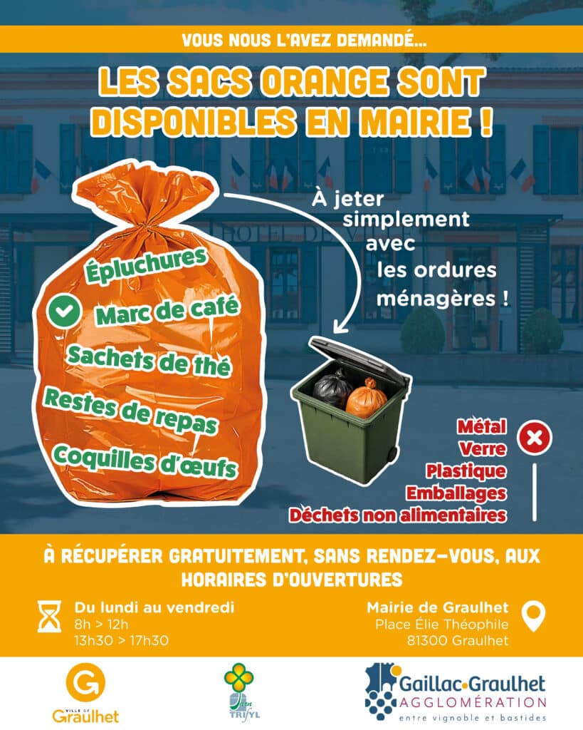 À partir du lundi 13 avril, vous pourrez venir récupérer gratuitement vos sacs orange à l’accueil de la mairie de Graulhet, aux horaires d’ouverture.