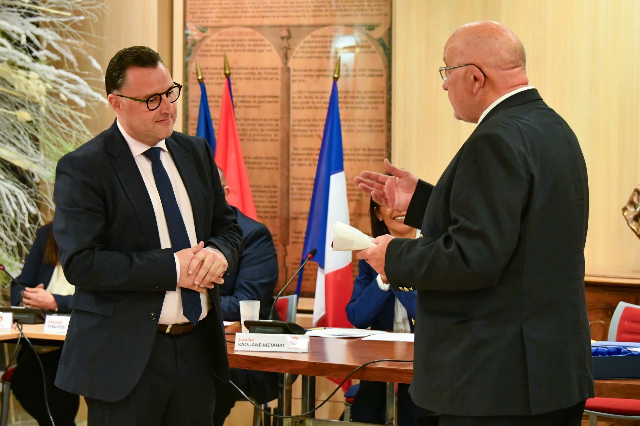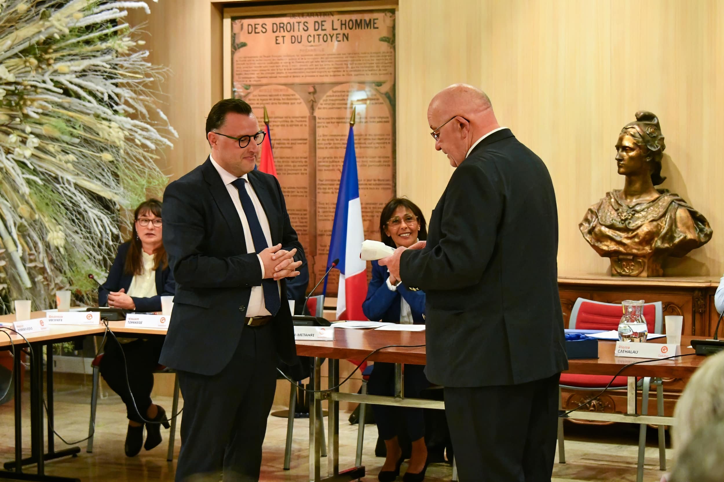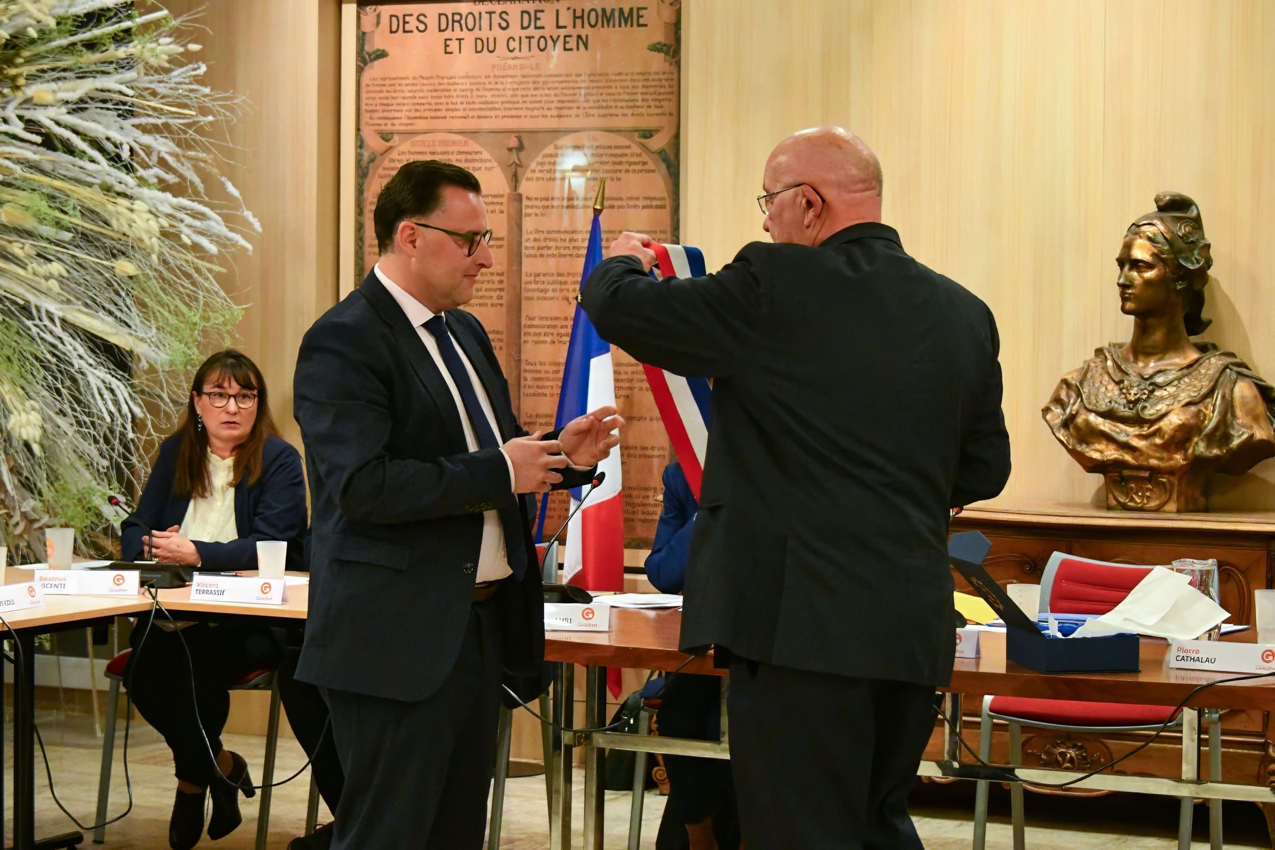 Benjamin Verdeil a été élu maire de Graulhet dès le premier tour, avec 26 voix sur 33 exprimées. Jean-Luc Cathalau lui a remis l'écharpe tricolore, symbole de la fonction et de la confiance républicaine placée en lui par ses pairs.